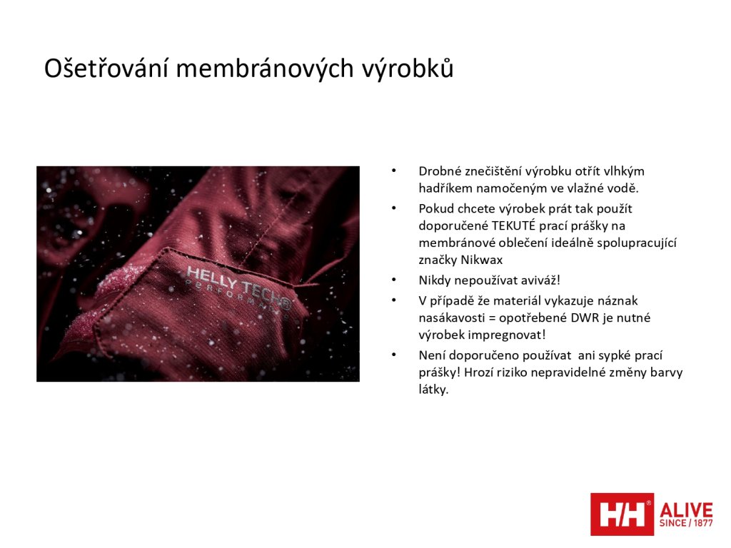 - vnější vrstva: 100% Polyamid, membrána HELLY TECH® PERFORMANCE, voděodolnost od 10.000 do 20.000 mm/m2/24 a prodyšnost od 10.000 do 20.000 g/m2/24hod, typicky používána úroveň 15.000 mm/m2/24 hod